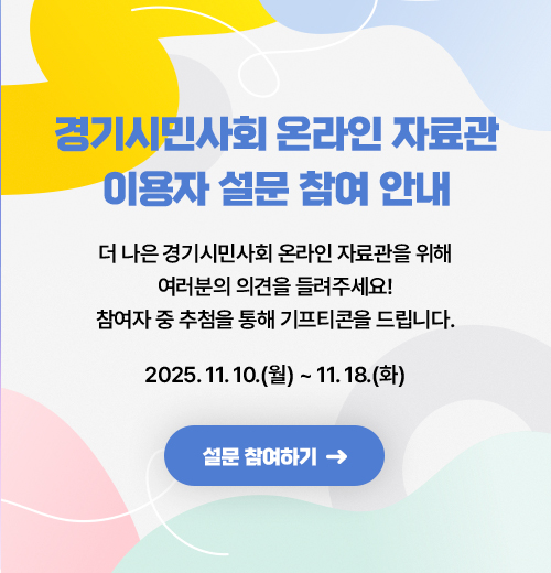 경기시민사회 온라인 자료관 이용자 설문조사(~11/18) 2025-11-10 2025년 경기시민사회 온라인 자료관 포럼 개최 안내(9/17) 2025-08-19 2025년 공익활동 아키비스트 양성 과정 안내 2025-04-29 경기시민사회 온라인 자료관 2차 포럼 개최 안내(11/29) 2024-11-04 2024 공익활동 페스타 시민사회전시회 전시관람 후기 이벤트 2024-10-10 경기시민사회 온라인 자료관 포럼 ‘416 세월호 참사 이후 생명과 안전을 위한 활동을 톺아보다’ 행사 안내(7/16) 2024-06-24 (~7/23) [경기도지속가능발전협의회] 육아휴직 대체 직원 채용공고 2025-07-14 [경기환경에너지진흥원] 기후미래직업 청년일자리 전문교육사업(~6/1) 2025-05-19 [경기도지속가능발전협의회] 상근 직원 채용 공고(~5/28) 2025-05-19 [아름다운가게] 2025년 하반기 아름다운가게 상근활동가 채용(~5/25) 2025-05-19 [사)수원여성인권돋음 부설 성매매피해상담소 '오늘'] 활동가 2인 채용합니다(~05/23) 2025-05-19 [포천나눔의집 이주민지원센터] 활동가 채용합니다(~04/30) 2025-04-15 [다음세대재단] 2025-2026 인권운동 및 활동 지원사업 모집공고(~10/13(월) 13:00까지) 2025-09-22 [사단법인 자원] 'drive your play' 어린이를 위한 창의적 놀이환경이 필요한 기관을 찾습니다.(~12월) 2025-09-10 [금융산업공익재단] 2025 제 2회 금융산업공익재단 사업공모전 개최(~8/29) 2025-08-19 [아름다운재단] 2025 공익단체 인큐베이팅 지원사업_신규선정 (2025.08.31. 접수마감) 2025-08-19 [GKL사회공헌재단] 2025년 사업 4차 수행단체 공개모집 (~7/24) 2025-07-14 [(재)공공상생연대기금] (지원사업) 공공상생연대 공모전(~8/22) 2025-07-14 [경기도공익활동지원센터] 공익활동 상담소 가이드북 : 단체설립, 등록허가 2025-03-31 [경기도공익활동지원센터] 경기북부 공익활동가 관계망 형성을 위한 기초조사 보고서(2023~2024) 2025-01-03 [서울연구원] 서울시 시민안전 거버넌스 운영현황과 개선방안 2024-03-21 [국가회계재정통계센터] 알기 쉬운 공익법인회계기준(2023) 2024-02-22 [경기도공익활동지원센터] 한눈에 보는 경기도공익활동지원센터 2024년 사업 안내서 2024-02-19 [경기도] 2024년 경기도 사회적경제 정책 사용 설명서 2024-02-02