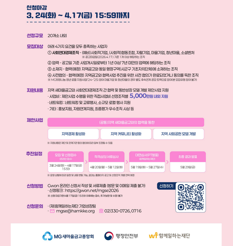 https://gwon.net/mgse2026 신청기간 (26.3.24~4.17.15:59) 목록 이전글 [아름다운 뿌리] 작은 비영리정기 모금 프로젝트 (~26.4.28) 26.03.30 다음글 [한국여성재단] 2026 여성건강지원사업 (치과진료지원사업 (~4.17) , 종합검진 지원사업 (~4.17) , 건강증진지원사업 (~4.24) 26.03.30