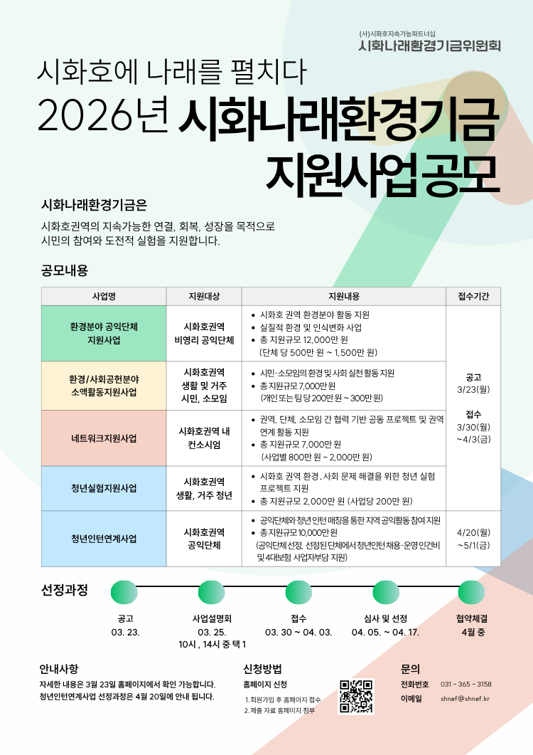 시화나래환경기금은 시화호 권역에서 이루어지는 다양한 공익활동을 지원하기 위해 청년, 시민, 공익단체, 지역 네트워크를 대상으로 2026년 지원사업을 추진합니다.