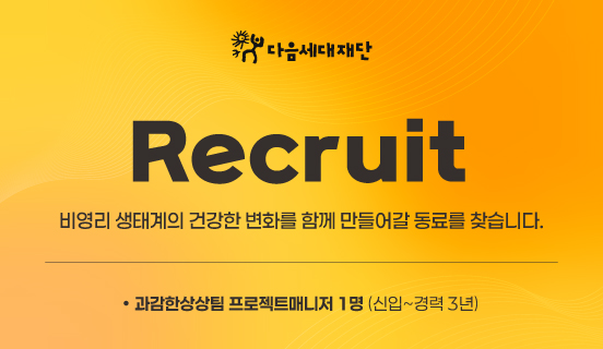 다음세대재단에서 일하다보면 언제나 더 나은 내일을 고민하고 일상의 변화를 직접 만들어가는 멋진 분들을 많이 만날 수 있습니다. 사회와 사람에 대한 폭넓은 관심으로 다양성을 존중할 수 있는 분을 기다립니다.